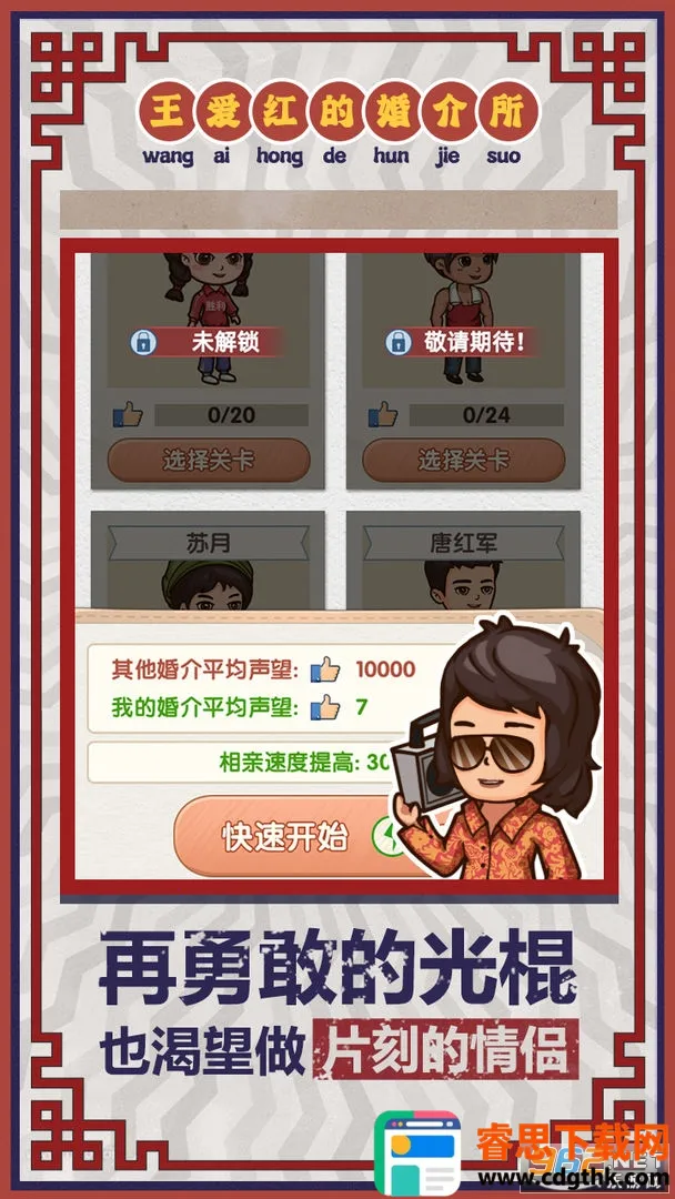 相亲模拟器游戏能让你体验经营婚介所的乐趣。在这里,你将身处80年代,扮演大龄女青年王爱红创办婚介所。游戏优势明显,画面设计精细活泼,无商业广告,体验超舒心。玩法丰富,要为不同人群投其所好安排相亲,通过特殊手段撮合,成功能获红娘费用。还有各种特色,比如有数十种人物及搞笑对白等你解锁,了解他们的爱恨情仇。从80年代到21世纪,你能通过经营升级小店,吸引更多客源。另外,鉴别偷心者、渣男挑战胜利可获金币和声望加成。游戏玩法不难,看条件、职业、好感度来判断相亲成功率,聊天注意回答别乱选,好感满了表白成功率大。总之,这款游戏能让你感受不一样的相亲体验,快来下载试试吧。