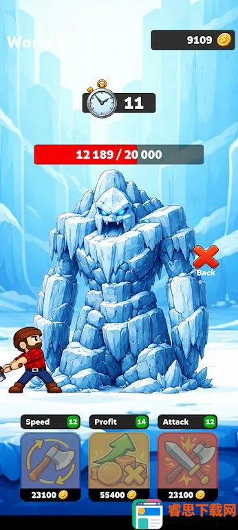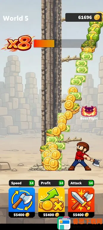 3. 首领战与新区域:随时挑战强大首领,运用点击机制击败他们可解锁新区域,每个木材价值更高,能带来更快进度、更高收益和丰厚奖励。