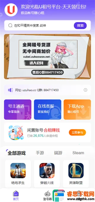 1、下载安装手游助手app,随后前往u租号平台。然后在官网下单,下单完成之后就会获得一个秘钥。
