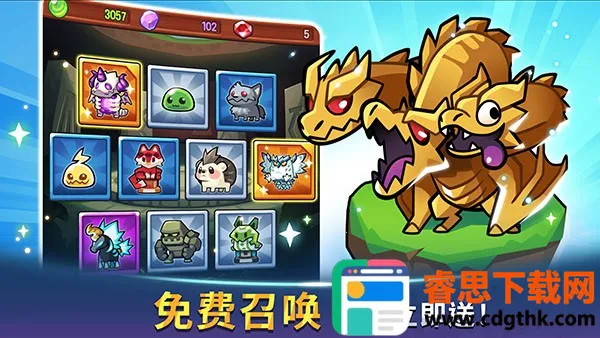 魔物召唤收集体系丰富:提供60余种怪物伙伴,分普通稀有史诗传奇四档稀有度。每只怪物攻击方式与终极技能独特,如熔岩恶魔范围溅射、史莱姆王减速毒液,收集与搭配策略性强。