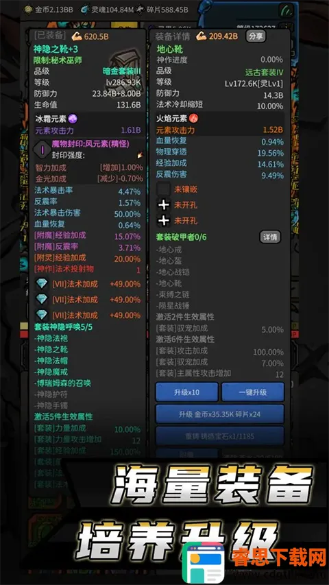 升级:升级要用到金币和碎片,通常是缺少碎片,不建议乱升级,优先升级经验套装,这里有两个概念,等级和灵等级,玩家升级的都是灵等级,灵等级的意义在于可以提前升级,也就是说当你转生时,如果你装备的灵等级是1000,那么你在一千级之前都不用升级了,他会跟着你一起升,新鲜的装备灵等级都是1,所以第一世找等级高的装备穿上就行,因为通常你装备的升级速度是跟不上你的升级速度的,把词条不错的装备锁起来放在下面慢慢培养,转生的时候再穿就行。关于转生的概念在后面讲解。