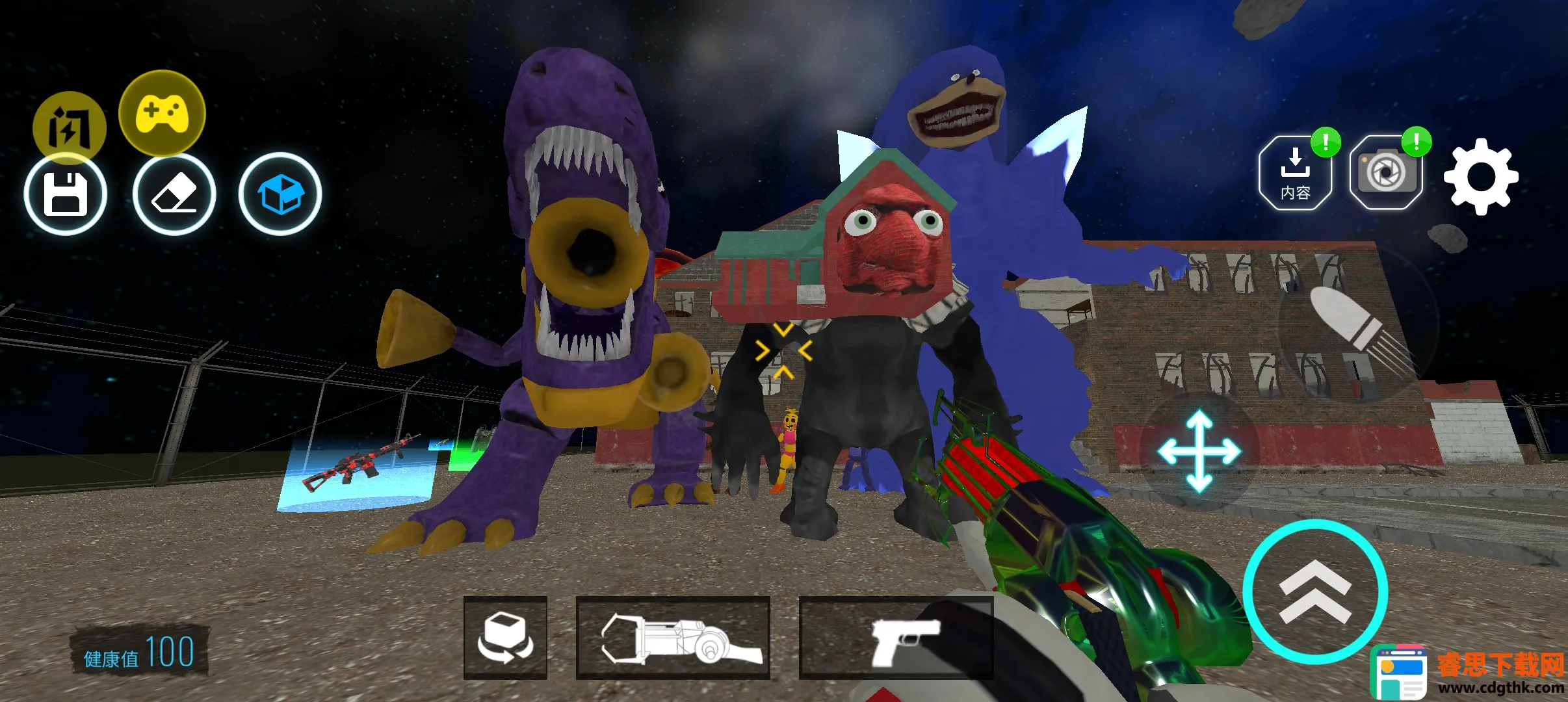 2. 高自由度场景构建:置身浩瀚太空星系,玩家可自由放置武器、飞船或怪物单位,还能支持奔跑、飞行与射击操作,自行编辑与设计怪物形象,打造完全属于自己的沙盒战场,玩法几乎没有任何限制。