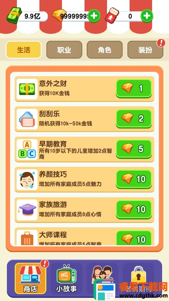 1. 高度自由成长:无预设目标与线性任务链,成长节奏和人生方向全由玩家掌控。可专注事业、深耕家庭或探索多重可能,职业路径灵活,能随时更换工作,未开放岗位可用黄钻解锁,降低试错成本。