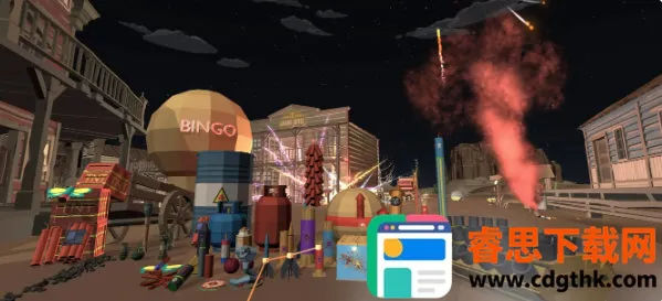 双模式燃放体验:FPS模式可在城镇西部武士恐怖宅邸等地图自由漫步,手持点火器在任意位置燃放;构建模式能像专业烟火师一样编排烟花表演,设置机架连接保险丝调整时序。