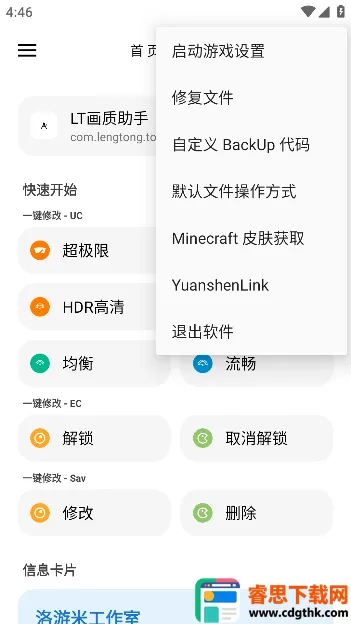 LT画质助手是一款超棒的游戏辅助工具。它能帮咱提升游戏画质,解锁更高质量的画质帧率,还能修改各种参数,比如分辨率、阴影效果等。不管是高端机型想追求极致画质,还是中低端机型因性能受限,它都能搞定。对于追求极致画质的高端机型用户,可解锁HDR与120帧超清画质;中低端机型用户有小白衣模式等优化方案。它操作简单,新手小白也能快速上手。软件内功能清晰,操作迅速,默认多种画质供咱挑选,还支持自定义设置,能满足不同需求。有了它,咱能提前预览调整效果,在游戏里获得更精准的调节方案,让游戏运行更流畅,体验更棒,适配多种热门和小众游戏,解决咱在游戏中的各种画质问题,享受更精彩的游戏时光。
