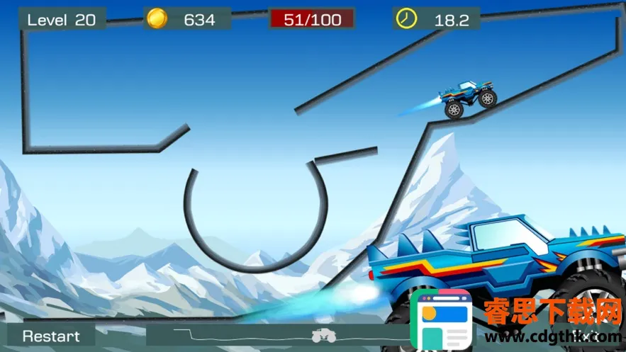 4. 丰富奖励机制:控制大脚车尽快通过精心设计的道路到达终点,得分越高获得金币越多。在空中旋转360度可获额外奖励,激励玩家不断挑战高分。