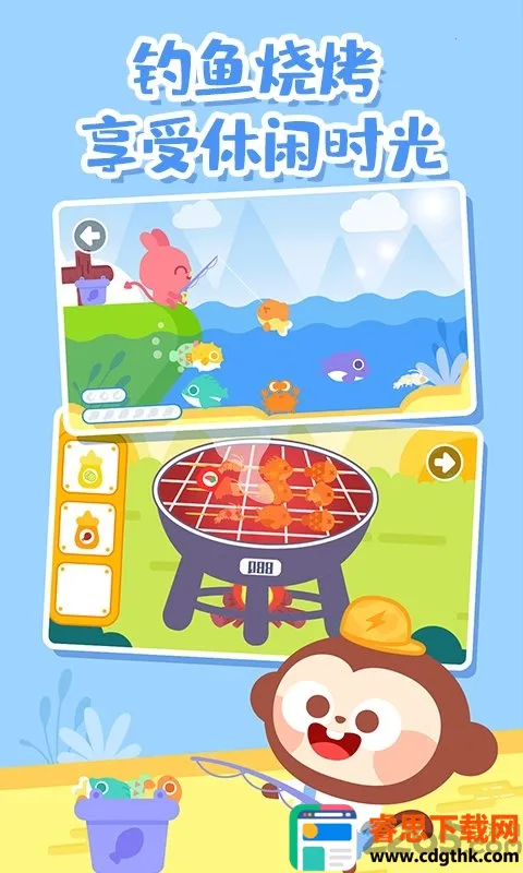 趣味游戏,全面发展:软件包含钓鱼大比拼、草上滑板、放风筝、捉蝴蝶、野餐时间等多种趣味游戏,能锻炼孩子的耐心、反应速度、操作技巧、观察力、创造力等多方面能力,促进其认知、反应、动手能力和美感等多方面发展。