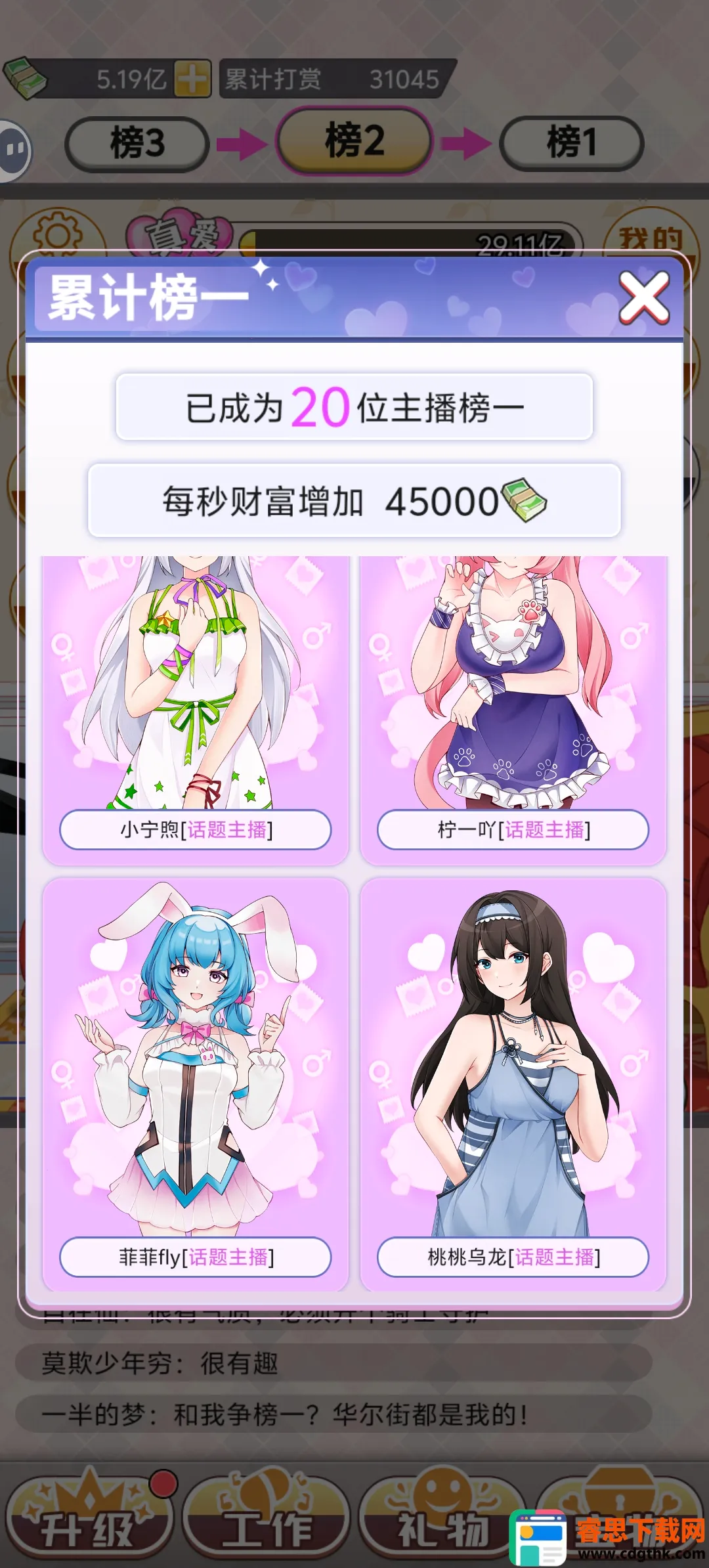 榜一模拟器是模拟主播互动游戏,玩家当榜一大佬,与主播互动刷礼物。有多种主播待攻略,能解锁丰厚礼品、升级勋章。玩法包括选主播关注、赠礼交流,好感度够可解锁更多内容,还能与其他玩家互动竞争。