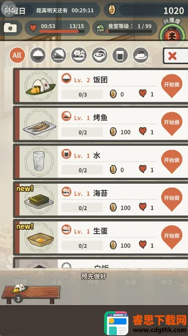 2. 渐进式料理系统:从基础饭团解锁,重复制作提熟练度,逐步解锁60余种日式料理,部分隐藏菜谱需剧情触发或食客灵感提示。