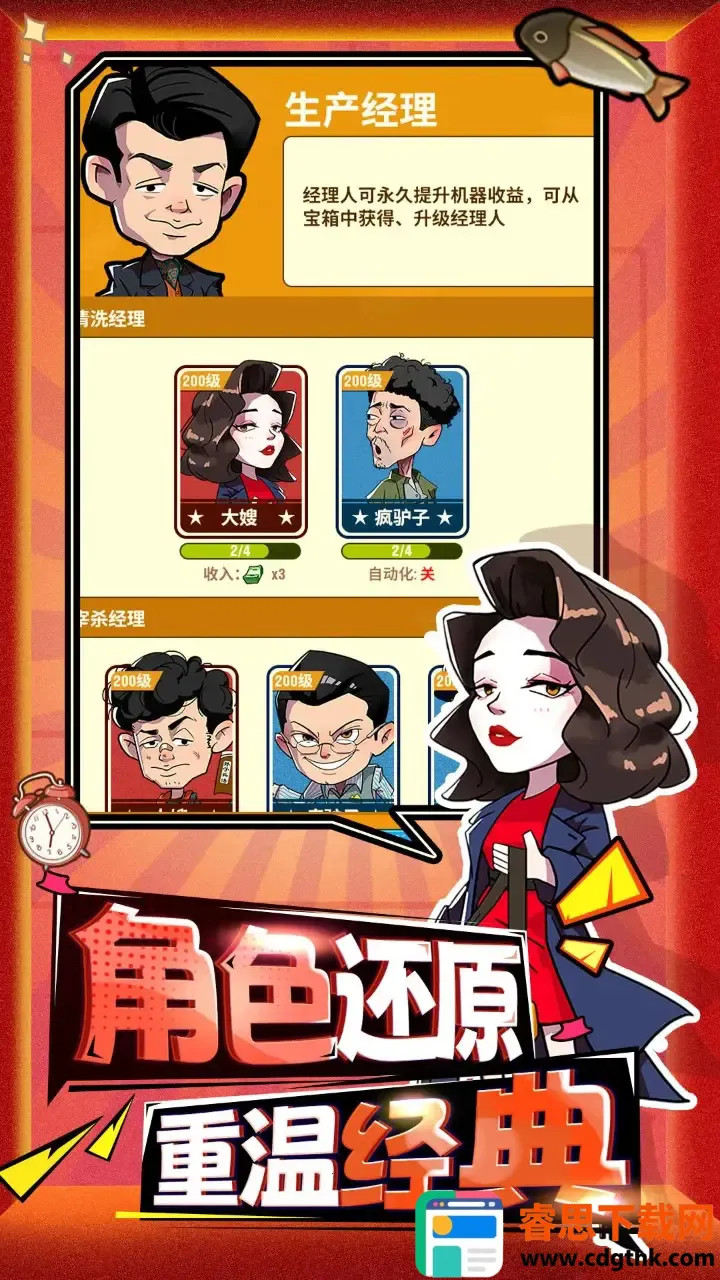 3. 策略养成,高效运营:可雇佣员工、收集加成人物卡,通过升级优化生产效率,把控工厂升级节奏实现高效运营。