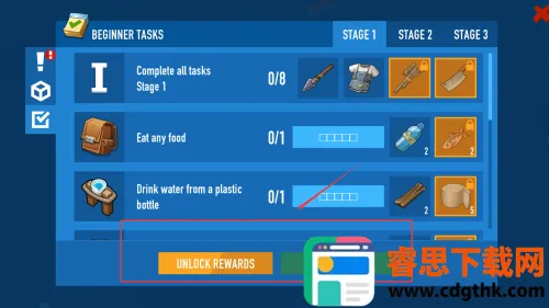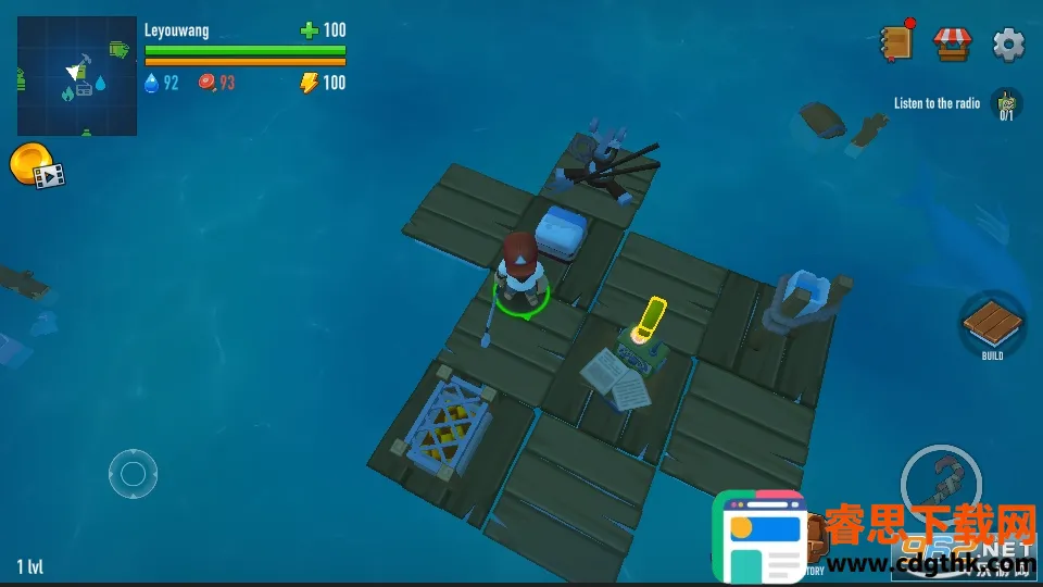 1、开局阶段玩家处于木筏之上,需要利用钩索打捞海洋中漂浮的物资箱,获取基础资源如木材与塑料等材料。