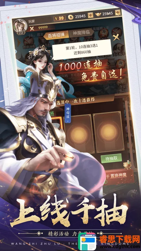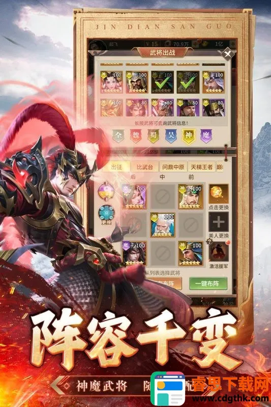 丰富武将搭配:有上百位各具特色的武将,可自由选择不同阵营,策略搭配最强军团。还能免费自选神将,自由搭建满配阵容,零资源损耗,无损换将,不肝不氪也能称霸天下。
