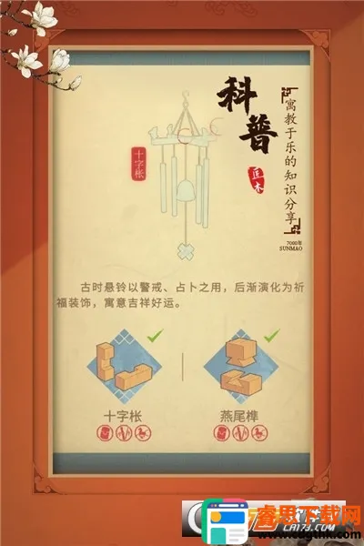 这是一款独具魅力的解谜游戏。它以榫卯为题材,将国风韵味与解谜体验巧妙融合,让玩家在感受千年木作结构美学的同时,领略中国古文化的博大精深。游戏上手容易,通过观察图纸、点击消除等操作拼合榫卯结构,解开空间谜题。馆藏板块能360度呈现组合原理,科普榫卯历史文化。玩家还能在切磋板块发挥想象设计关卡。其画面极具中国风,关卡充满创意,bgm更是让人沉浸其中。整体将休闲与解密完美结合,带来独特且精彩的游戏体验。