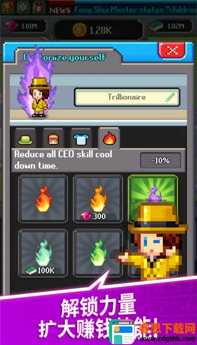 点点亿万富翁是一款超好玩的休闲放置类手游。它能让你体验亿万富翁的人生,拥有自己的公司,通过轻松点击和简单操作来经营。开局点击屏幕积累初始资金,雇佣交易员自动买卖商品,遵循低买高卖原则,解放双手实现离线收益。随着公司发展,可升级办公环境,购买装饰品个性化商业帝国。后期优化管理,解雇表现不佳员工,利用股票系统投资炒卖。游戏中还有各种技能和特色玩法,比如升自己等级,开前三个技能,分红时留点击buff和技能给投资人,有钱就升级员工等级,攒钻石抽奖或买饰品。它的像素画风复古有趣,玩法多样,能满足你当老板经营公司、体验财富增长的乐趣,快来下载开启你的亿万富翁之路吧!