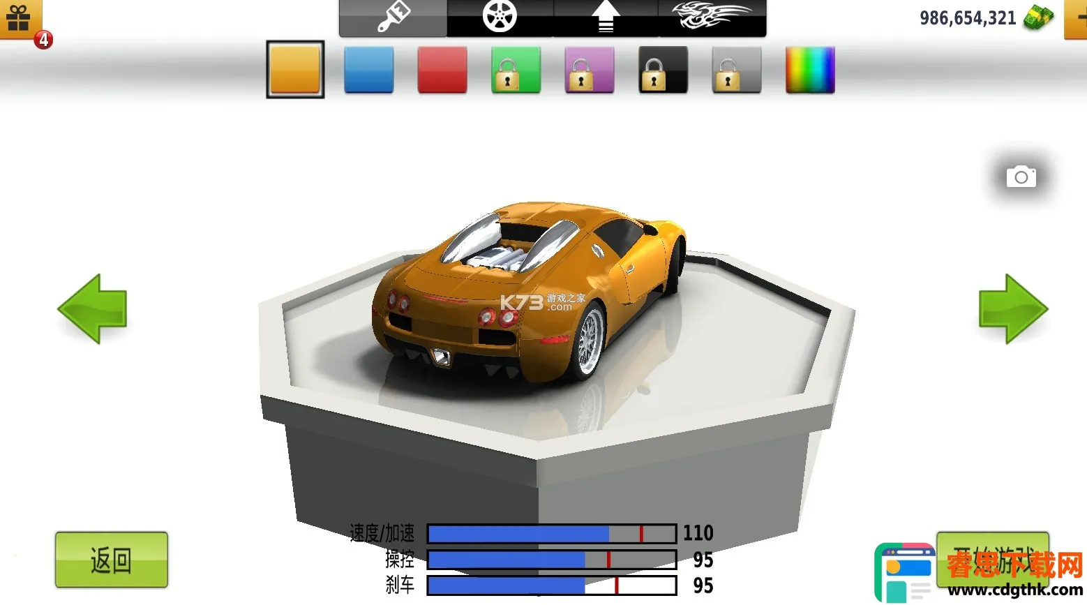 3、丰富竞技模式:丰富多样的竞技模式极大增强了可玩性,从经典竞速到淘汰赛、车辆收集挑战等,保证游戏体验长久新鲜不腻。
