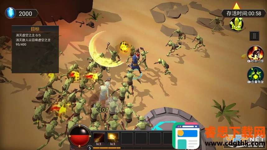 4. 玩家需不断挑战自我,刷新生存记录,消灭更多敌人完成任务,随着游戏等级提升,消灭敌人获取能量,以提升战力。