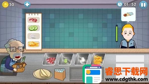 这里玩法简单又有趣,采用模拟经营玩法,你要服务客人,制作各种美味食物来获得金币并升级店铺。比如制作沙威玛卷饼,根据客人要求添加调料、准备食材,准确完成订单就能收获夸奖,还能把小店发扬光大。