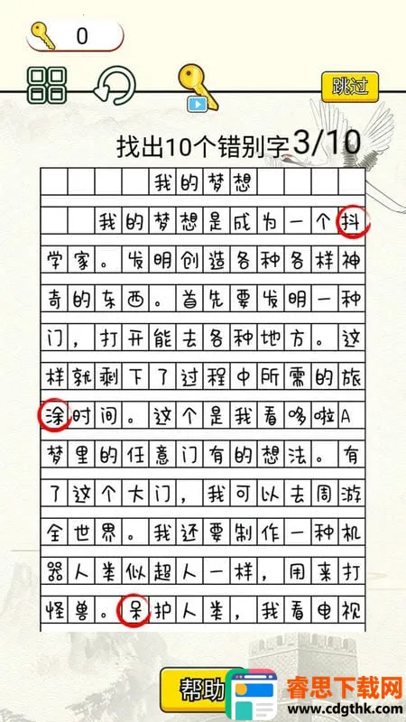 玩法简单易上手,每日签到开启挑战,载入文本后仔细找错点击标记,正确找出有奖励,目标是找出所有错误。它的特色超多,包含多维度错误类型,部分错误需推理判断,还藏着历史典故等彩蛋。亮点也很突出,海量原创文本,动态难度设计,即时反馈解析。照着攻略来,打开游戏点击开始,进入场景找错别字,点帮助获取提示,找齐 10 个进下一关。快来体验,锻炼脑力,享受找错乐趣!