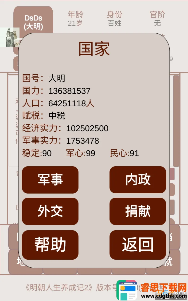 这款明朝人生养成游戏很有意思!玩家能穿越到明朝开启传奇人生,有超多内容可选,像入朝为官、投身征战、经商种田等。游戏按历史节点更替皇位,还有很多历史事件,能让人感受大明风云。