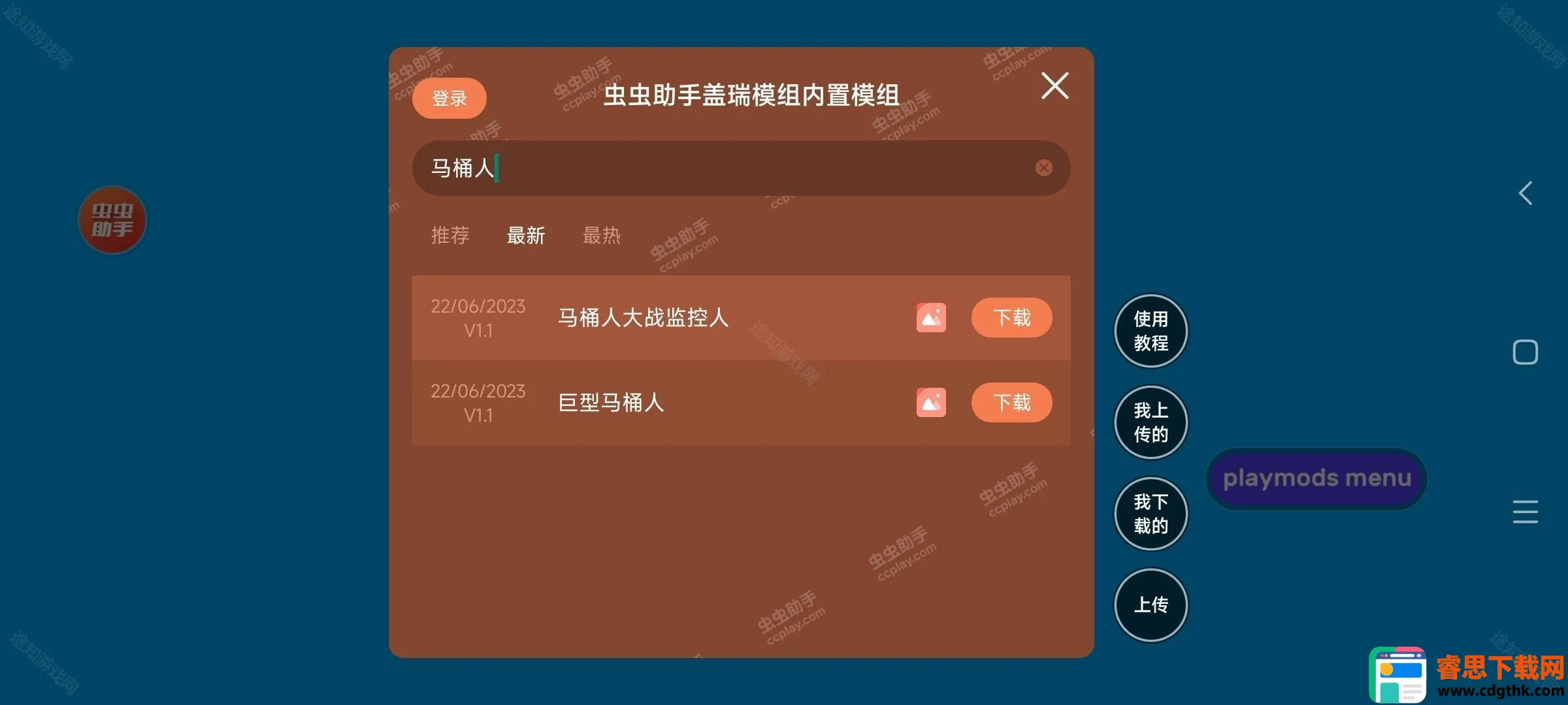 2、点击红色的虫虫助手按钮,然后在搜索框搜索马桶人。