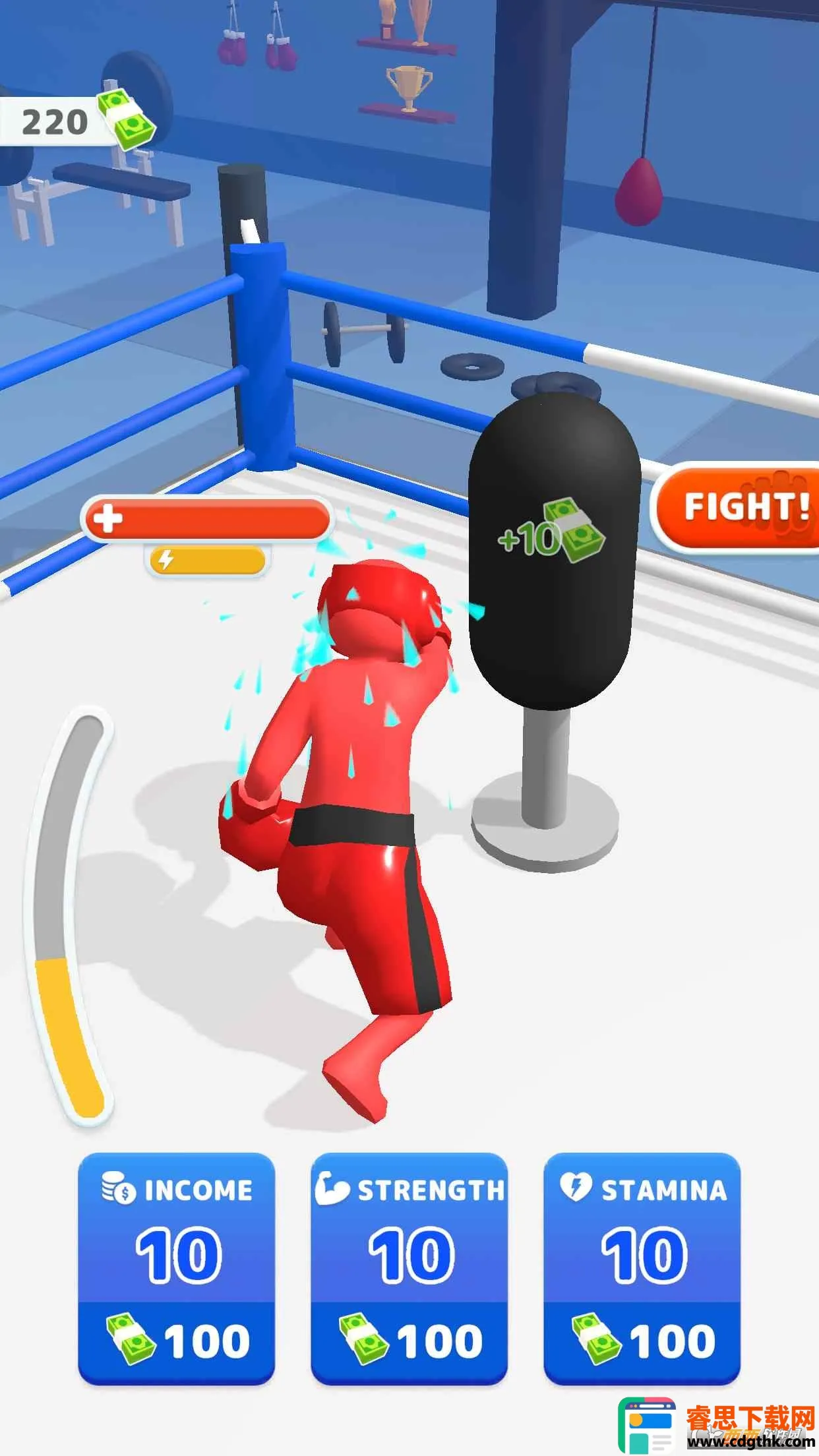 3. 多样游戏玩法:点击屏幕控制拳击手击打沙包获奖励,花费钞票升级属性,点击FIGHT开启对战挥拳出击。游戏开始点击屏幕攻击,能量条满有额外加成,选择属性升级,战胜对手解锁新阶段与奖励,提升排名。
