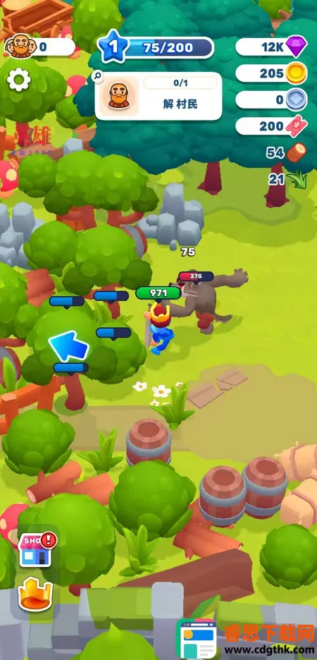 在游戏里,拖动屏幕就能控制角色移动,靠近怪物即可战斗,消灭敌人能掉落金币。上方有指引任务,跟着做就能迅速上手。有了足够资源就能开始建造设施,收集资源时还能解救更多人。建造市政厅后可恢复血量。