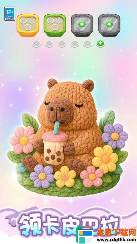 2、可爱的卡皮巴拉正在喝着的珍珠奶茶,周围出现了不同颜色的花朵,需要点击黄色花朵、白色奶茶。