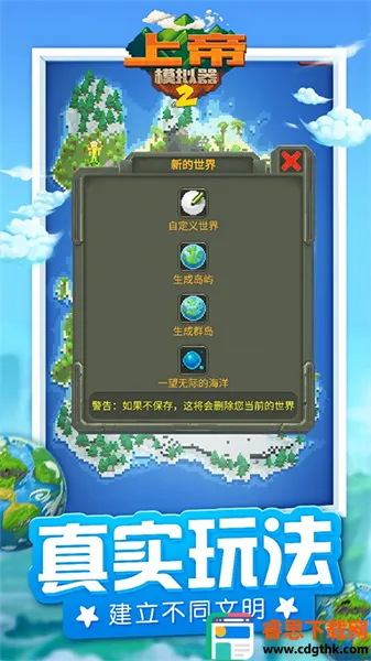 想体验从创世到现代文明演进的超爽过程吗?那就来试试上帝模拟器2吧!在这游戏里,你就是全能的上帝。能亲手雕琢山川河流,孕育生命文明,也能引发酸雨核弹,制造末日灾变。它有人类、兽人、精灵、矮人四大种族,会自主发展文明。你能引导他们结盟共生,也能挑起战火。上百种道具让你掌控自然、改写法则。这里能真实模拟火山喷发、陨石撞击等灾害,看生物进化、文明崛起。还能用多样工具雕琢大陆。想进入现代文明也不难,运行游戏后,按提示完成教程进入主世界编辑模式,投放人类,播撒资源,等出现摩天楼、电网和高速公路图标,现代文明就诞生啦!之后就能自由切换视角,深度参与全球演化,享受创造与破坏的双重快感,感受文明发展的奇妙旅程。