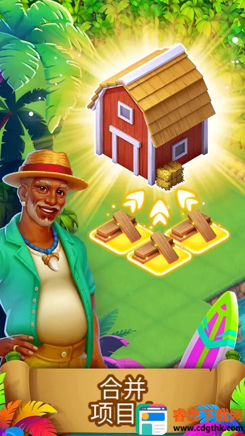 2. 策略性合成扩展:通过相同物品合成推进游戏,每次合成获经验和金币奖励,随着等级提升解锁更多玩法,开启全新热带岛屿生活。
