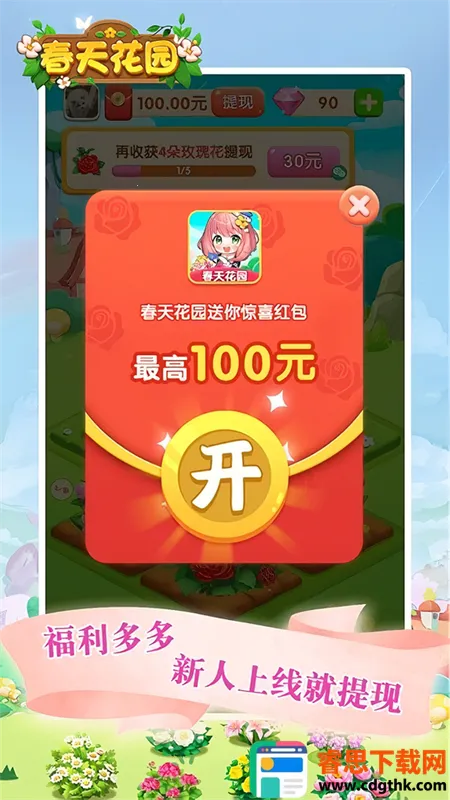 春天花园是一款休闲田地种植类游戏,玩家在花园种植特色花朵,收获可领红包。玩法简单,按时浇水施肥开花得奖励,还能解锁图鉴、扩张花园,完成订单、任务可获钻石红包,躺着就能赚钱。