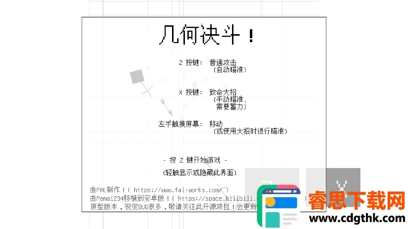 游戏操作简便,z 键开始,普通攻击用 z 键,x 键释放致命大招,左手触摸屏幕可移动或瞄准。白色是己方,能随意旋转,要小心别被黑色几何击中。