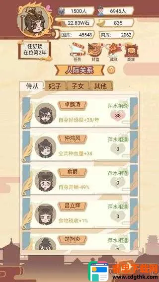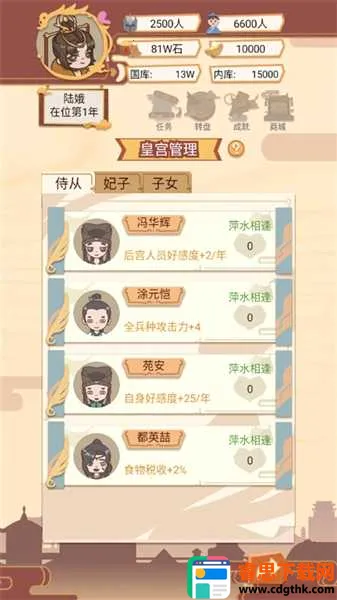 4、皇宫管理:统筹后宫人员编制与俸禄发放,侍从好感度满值后可晋升为妃子,属性加成翻倍,但年度开支同步大幅上升。