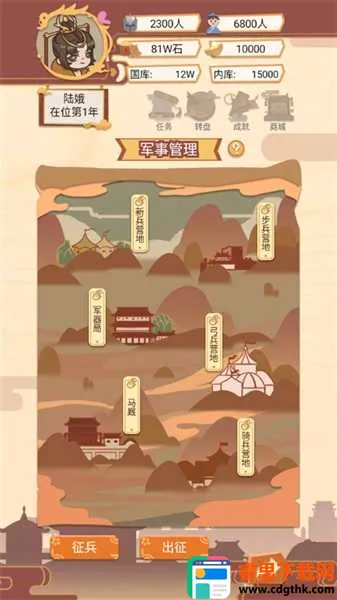 3、军事管理:升级四大兵种营地(步、骑、弓、工),增强征兵容量与部队战力,还可亲自率军出征平定叛乱或开疆拓土;
