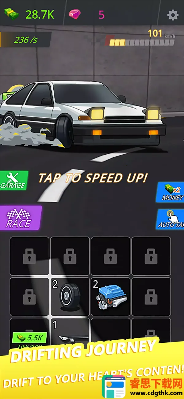 放置漂移是休闲赛车竞速游戏,玩家驾驶炫酷赛车在三大主题赛道体验漂移快感。操作简单,支持放置模式一键挂机。有 13 种模式、34 个关卡,可升级赛车、购买车辆,还有福利转盘等,玩法丰富。