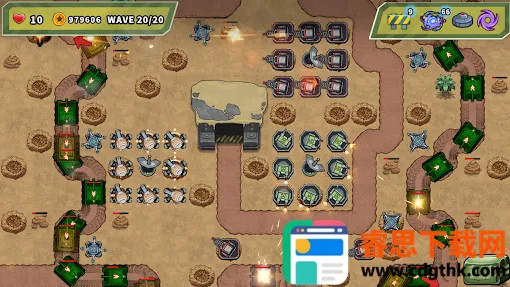 玩法很简单,选好关卡开始战斗,点击空白处放置炮塔,敌人出现炮塔就自动攻击,击败敌人能获金币造更多或升级炮塔。左上角显示生命值和剩余敌人波数,基地还有特殊技能。还能摧毁周围物品获取资源。