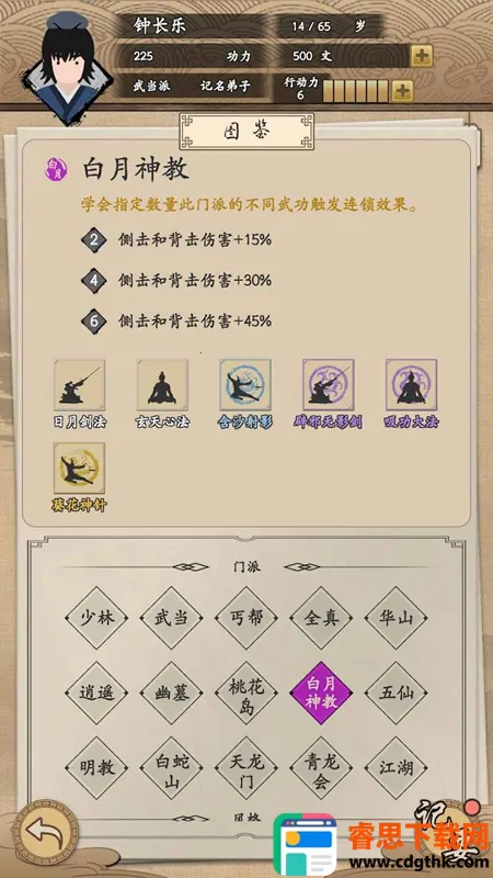 门派选择多样:开局能从特色各异的武林门派中挑选加入,习得限定功法。