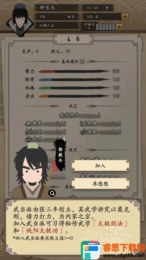 我的武侠梦破解版内置菜单,以明朝永乐为背景,玩家扮演新人侠客江湖冒险。可自由成长、自创武功,体验多种职业。破解版能使用无限武功秘籍技能点与金币,助你书写武林传奇,感受快意恩仇。