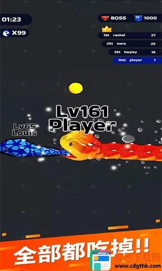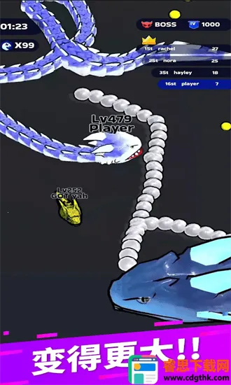 1. 吞噬成长机制:操控蛇吞噬等级低的其他蛇,在战场中灵活走位,不断成长,吞噬目标越多排名越靠前。