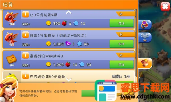 2. 多样的玩法体验:涵盖建造、模拟经营、养成、闯关战斗等玩法。玩家通过做任务获取金币、果实,用于建造建筑、升级龙,然后闯关,循环往复,乐趣无穷。