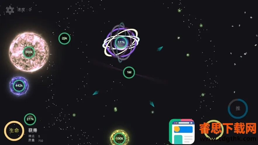 2. 独特成长体系:通过吸收物质增长质量,获取神点,利用神点让星球转化,形成太阳、月亮等更多星球,还能生成黑洞,不断发展星系。