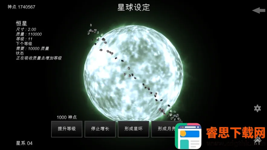 游戏玩法丰富多样,你要操控星球吸收矿石提升质量,收集神点后能让星球转化成太阳、月亮等更多星球,甚至生成黑洞。升级也很有趣,点击星球消耗神点就能提升等级,还能在星球周围形成月亮,让星球转化成中子星等。