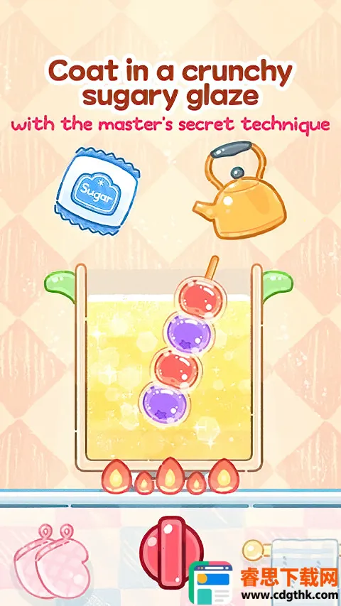 沉浸式制作体验:真实感十足的糖浆熬制与裹糖过程,玩家需精准控制糖浆温度与裹糖时机,带来沉浸式国风美食制作体验。